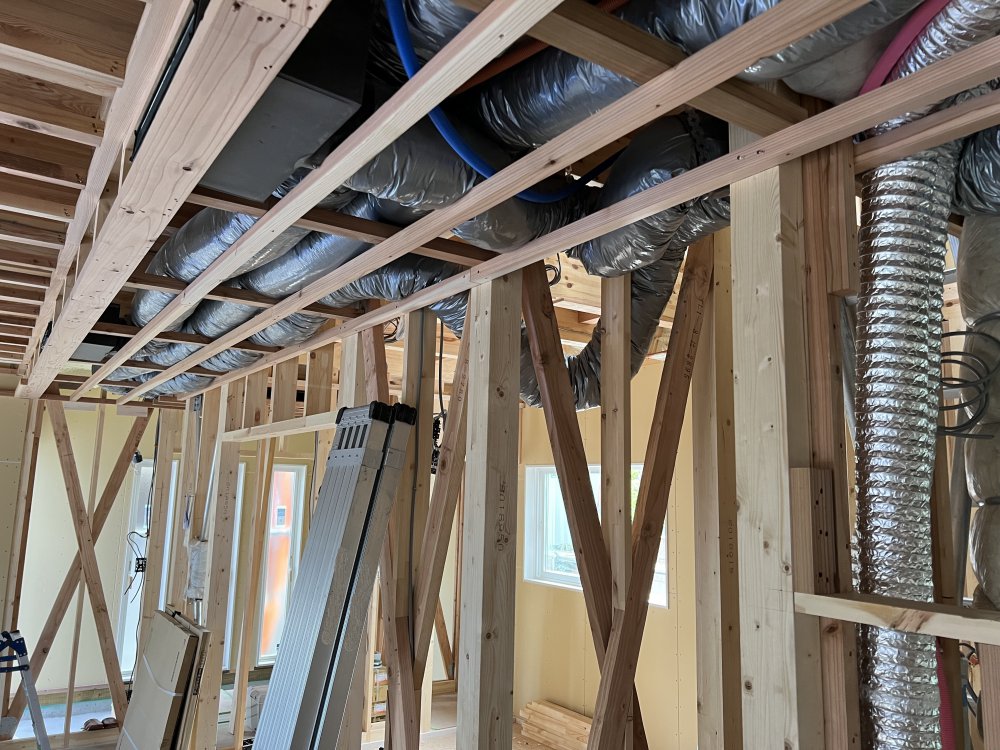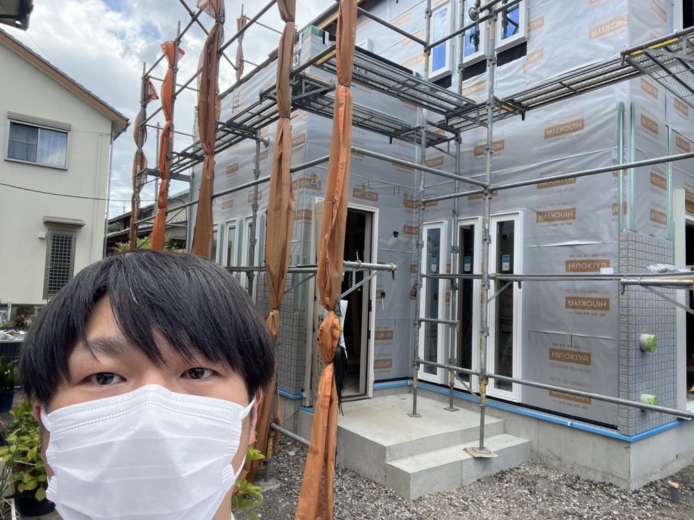 外壁も貼り始めており、内部では大工さんが暑い中工事を進めておりました