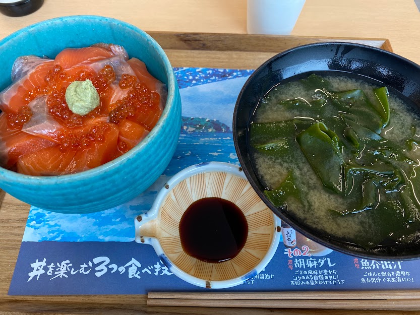 サーモン親子丼にこちらも鳴門のワカメがたっぷりのお味噌汁!