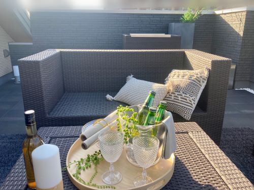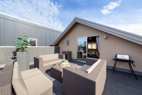 青空の下、リビングとしてくつろぐだけでなく、BBQも楽しめます。