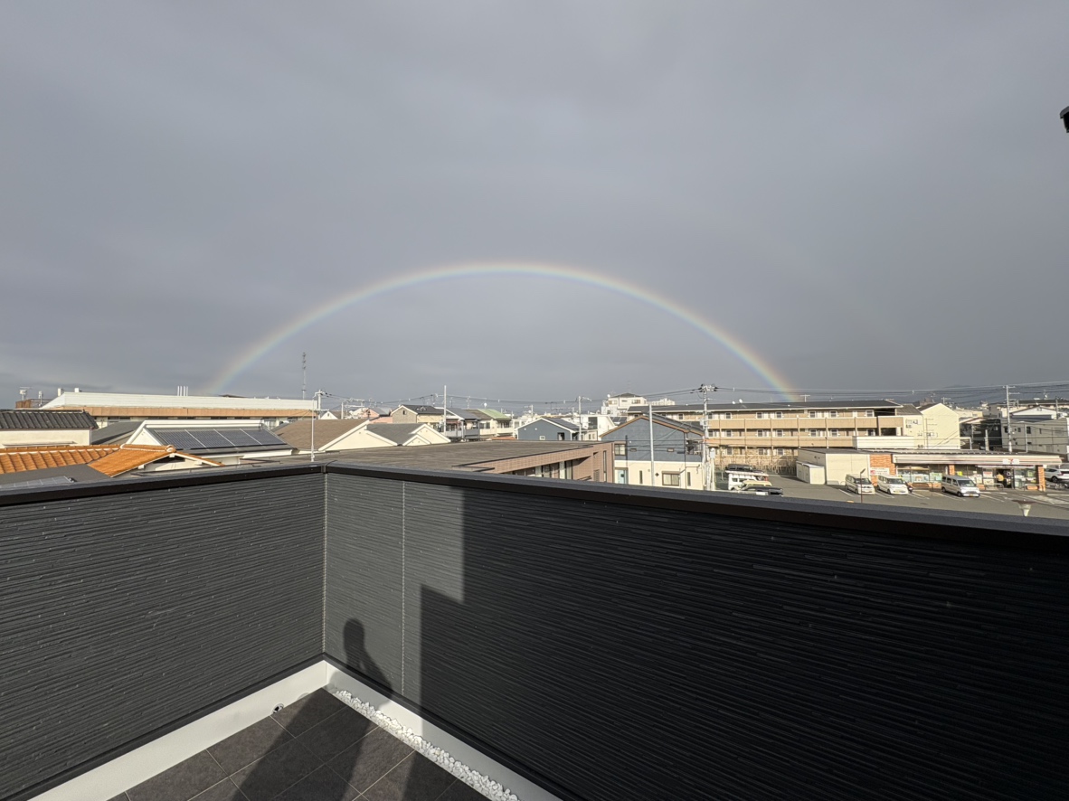 先日お引渡しの日にお客様と家の中を見て頂き屋上に出た時、虹が、出ていて