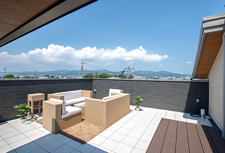配慮した庭として屋上周囲は屋根となっており、音も階下に響かないつくりで、屋外でも人目が気にならずプライバシーも守られます。
