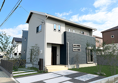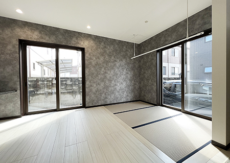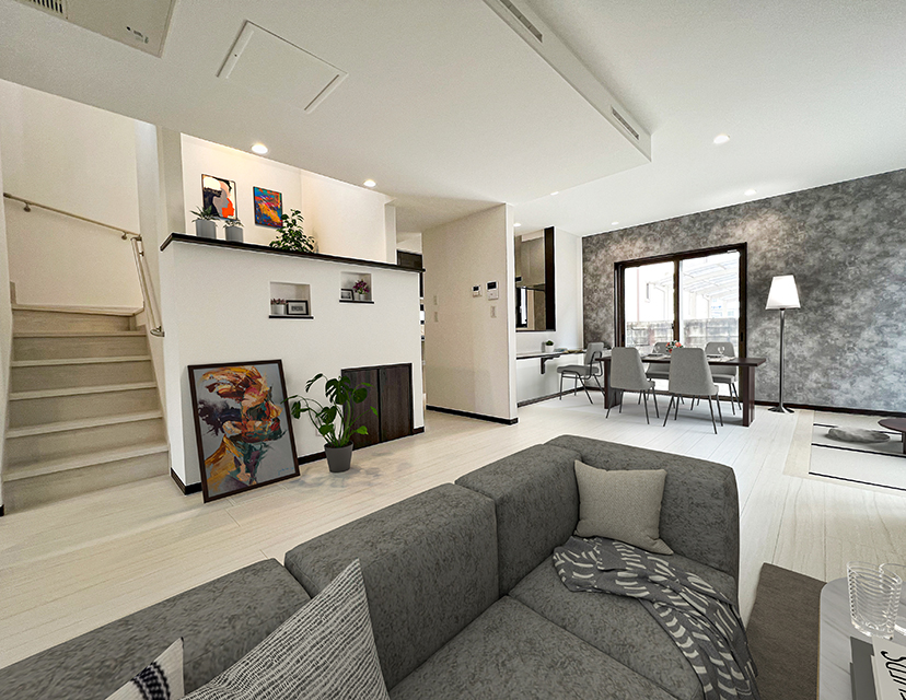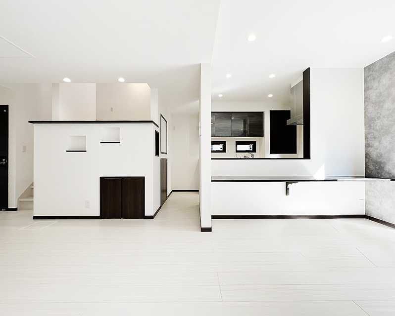 内装はシックモダンな印象を与えるモノトーン系。大人っぽく落ち着いた印象を与えます。和室のトーンを合わせることで統一感のあるLDKに仕上がりました。
