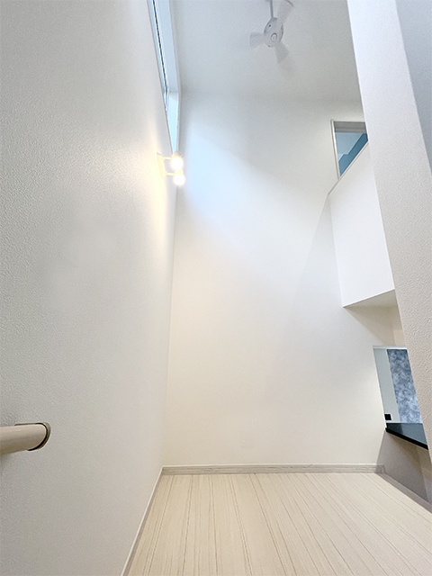 LDKにはスキップフロアを採用。少し高い目線からリビングを見渡すことができ、コミュニケーションが生まれます。スキップフロアの下には大きな収納スペースがあるので、日用品や季節ものの保管に大活躍。小屋裏収納を併用することでお家の中全体がすっきりとするのがこのお家の特徴です。