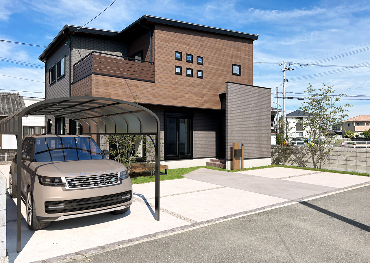 1階を主にタイル調、2階を主に木目調にすることでハイセンスな外観に仕上がっています