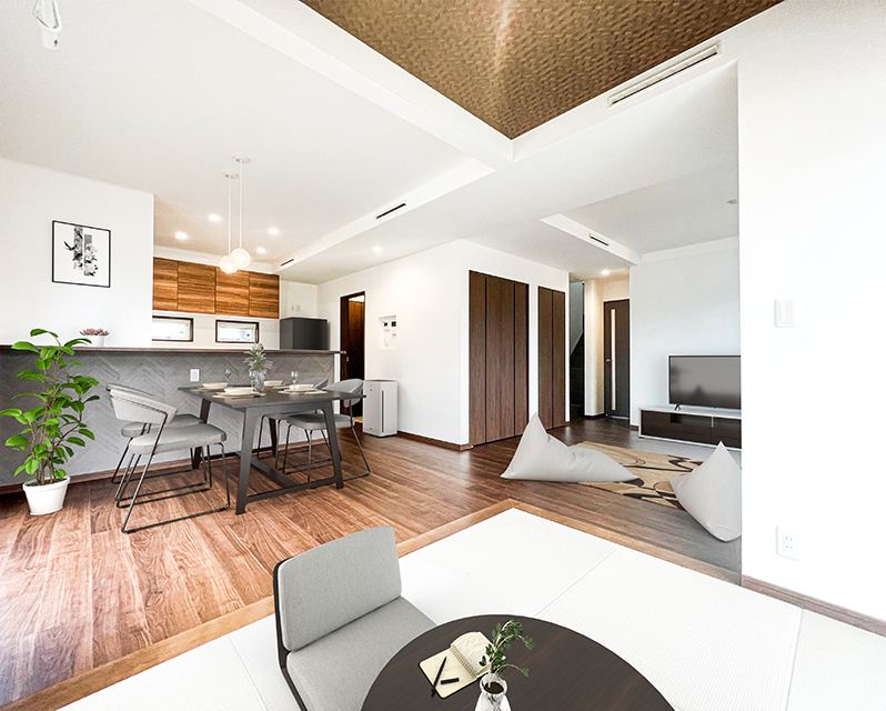 カップボードを木目調にしたり、和室の天井のクロスを張り替えたりすることにより上質な空間に仕上がっています