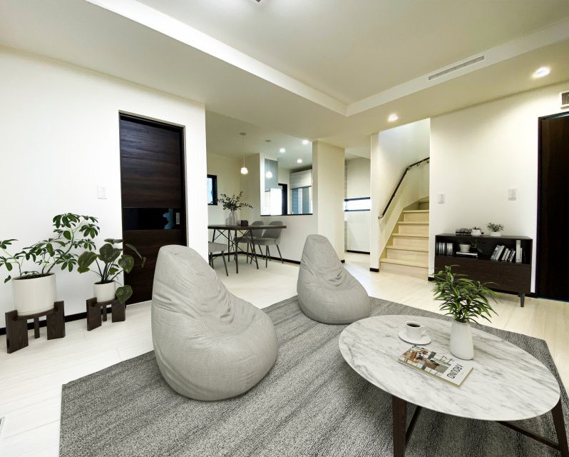 モノトーン調のリビングと和室のくつろぎ空間のあるお家
