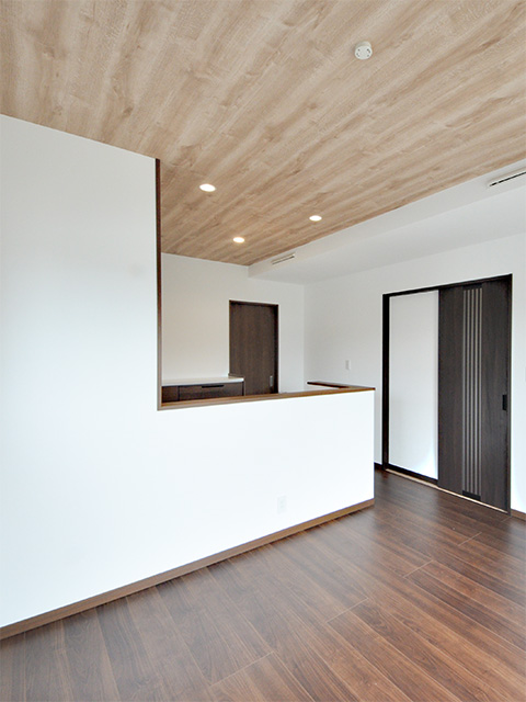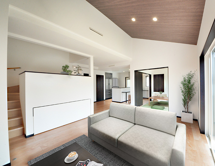 勾配天井にもなっているため、より広々とした空間を感じることができます。 -