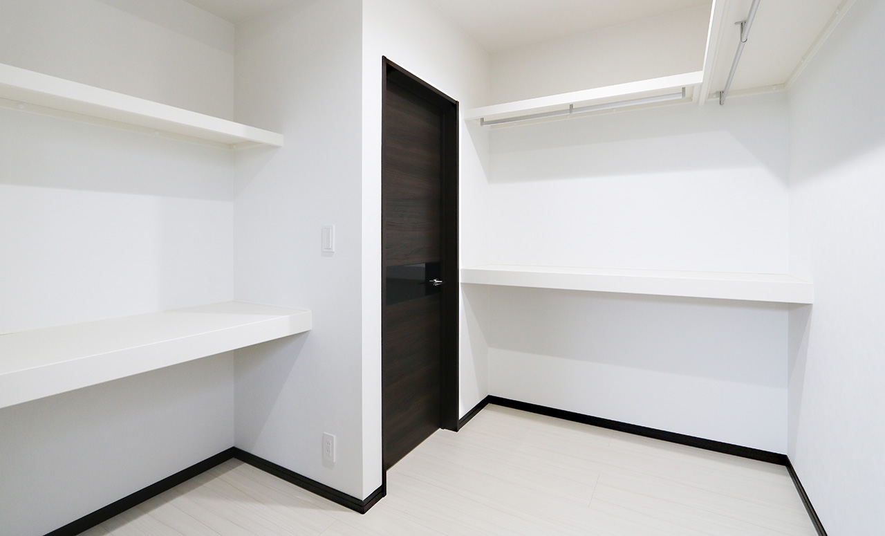 寝室とホールから出入りが出来るように造られたWICは先に寝てしまった家族を起こすことなく利用できます。