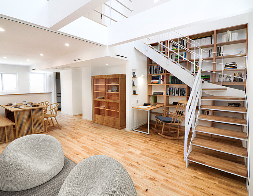 大容量本棚のあるオーセンティックモダンな吹き抜けLDK