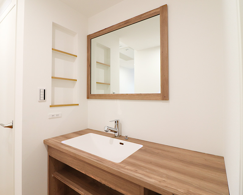木目の洗面所のニッチにも物を置くことができスッキリとした水回りを保つことができます。