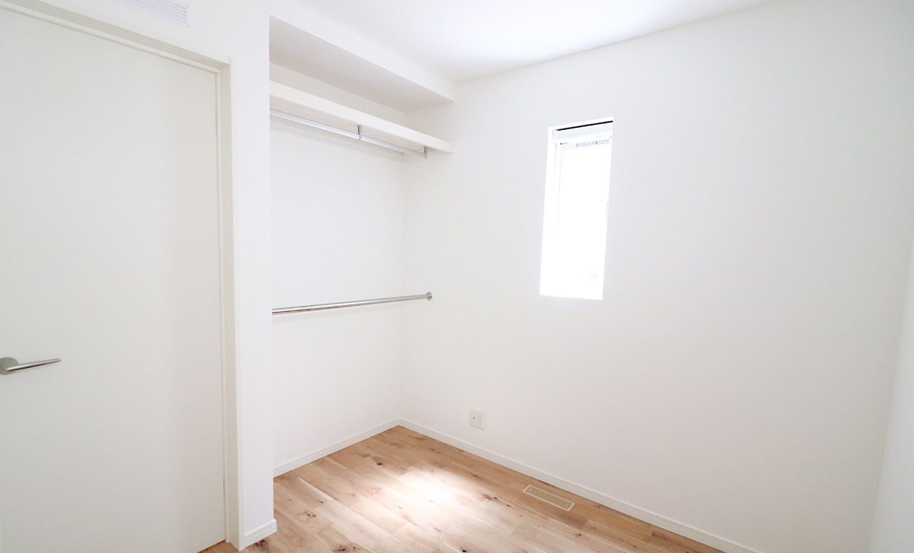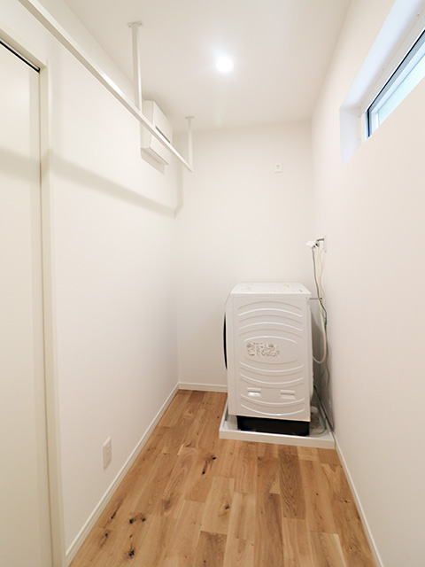 広めにとられた脱衣室は雨の日のたまった洗濯物でもカバーできるスペースで干すことが可能です。