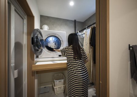 趣味でバイクに乗っているので、愛車を室内に保管できるようにインナーガレージを作ってもらいました。また、家事動線がスムーズになるような間取りを考えてもらったのと、アパートに住んでいたときに一番困っていた収納スペース不足を解消するためにたくさんの収納場所を確保しています。余計なものは全て収納しておけるので、室内はいつでもすっきり。あと、洗濯が楽になるように『乾太くん』を設置してもらったので、全体的に家事が効率的になりました。